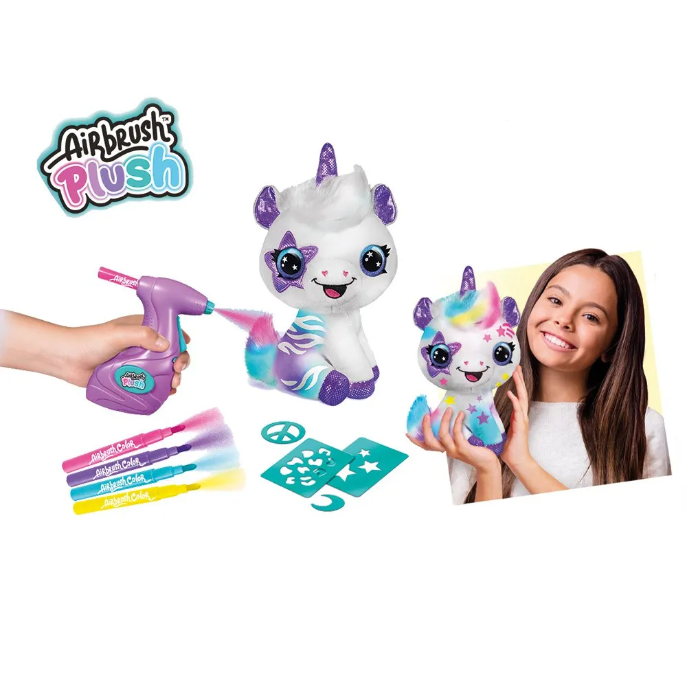 Dale un toque de estilo a tu unicornio, dale estilo a tu súper peluche de 10´´ de ancho por 10´´ de alto usando el aerógrafo que funciona con pilas, 4 divertidos rotuladores de tiza de colores y más de 100 diseños de plantillas.