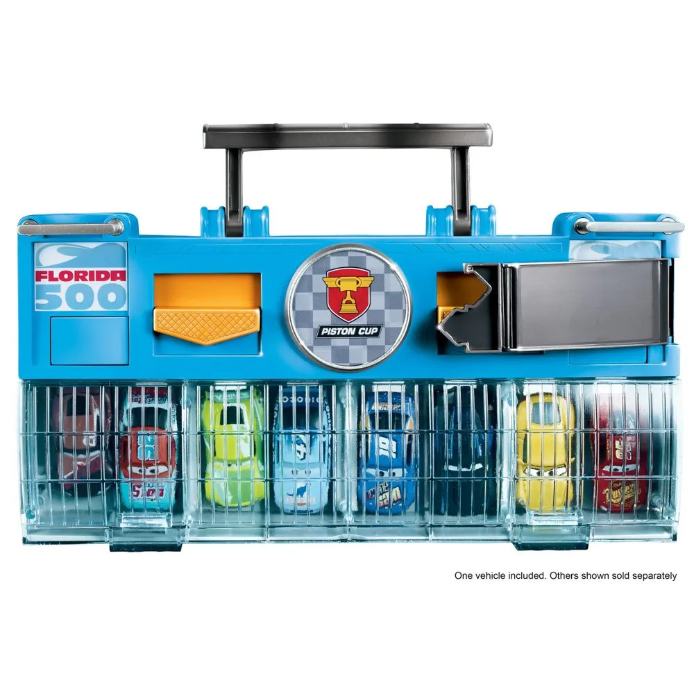Corre contra varios coches a la vez, ¡como los profesionales de verdad! Tras un agotador día de carreras, ¡todas las piezas de juego se guardan dentro del juguete junto con tus coches preferidos! Los vehículos adicionales se venden por separado y están sujetos a disponibilidad.