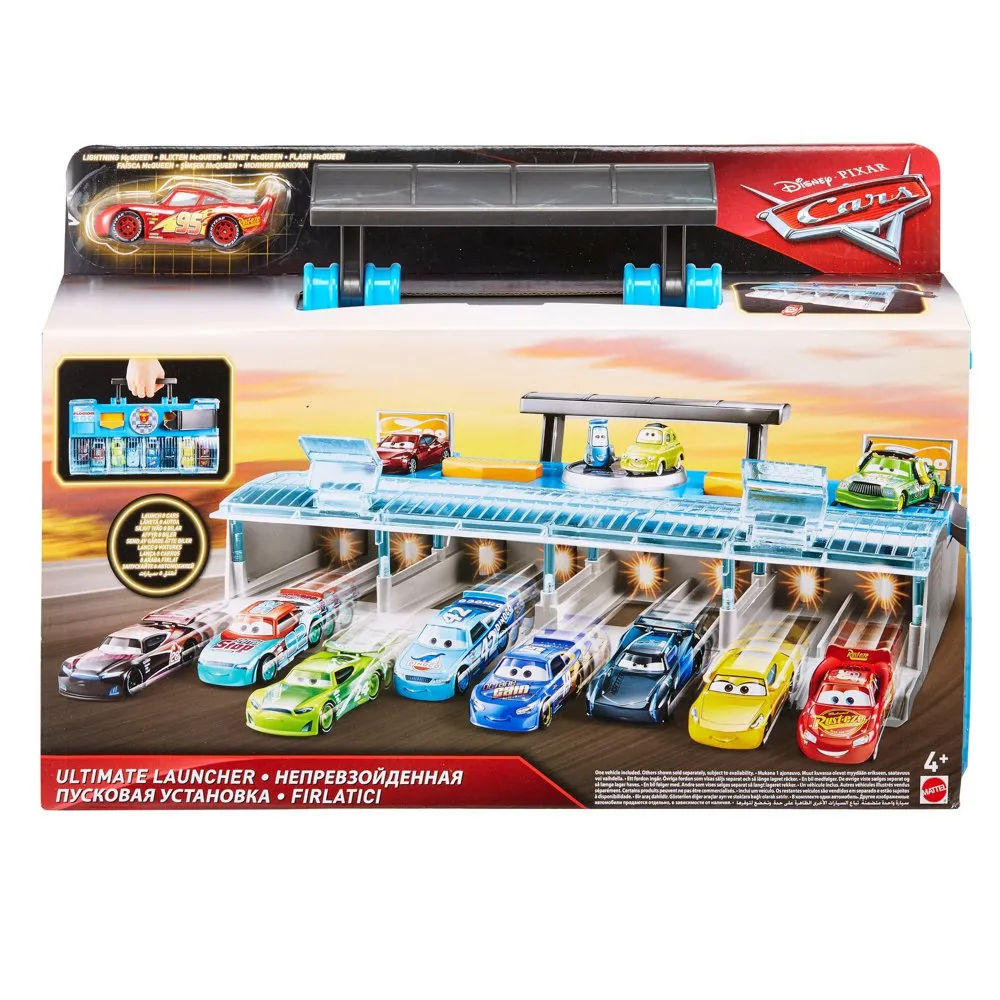 ¡Disfruta de las emocionantes carreras de Cars de Disney- Pixar con este lanzador de ocho carriles! Pon tus coches en la línea de salida y luego lánzalos a toda velocidad.