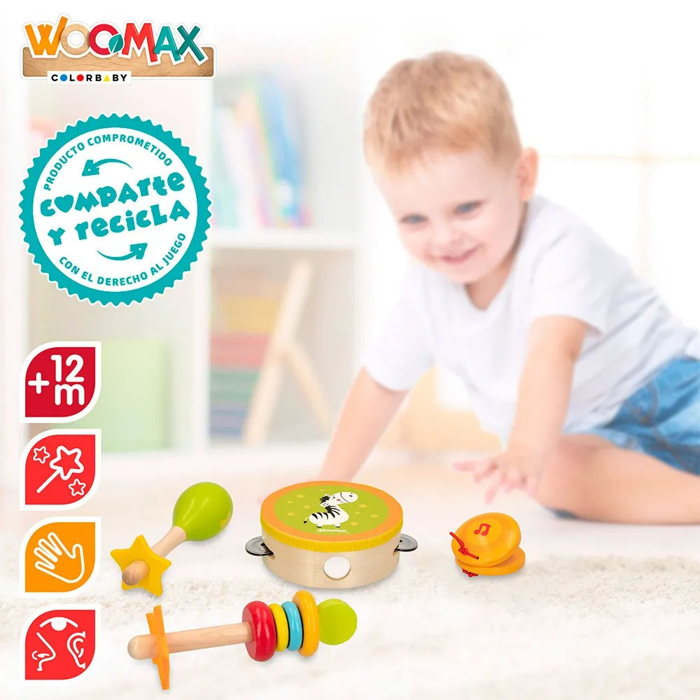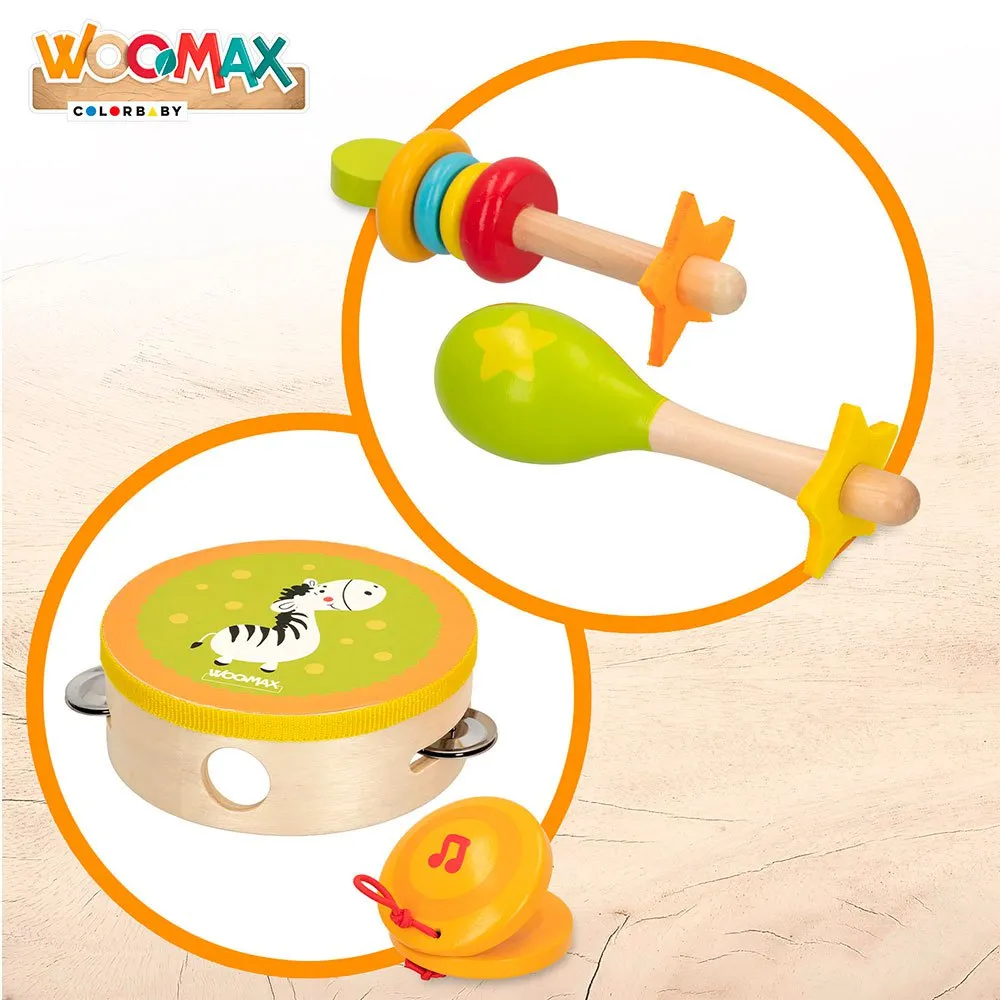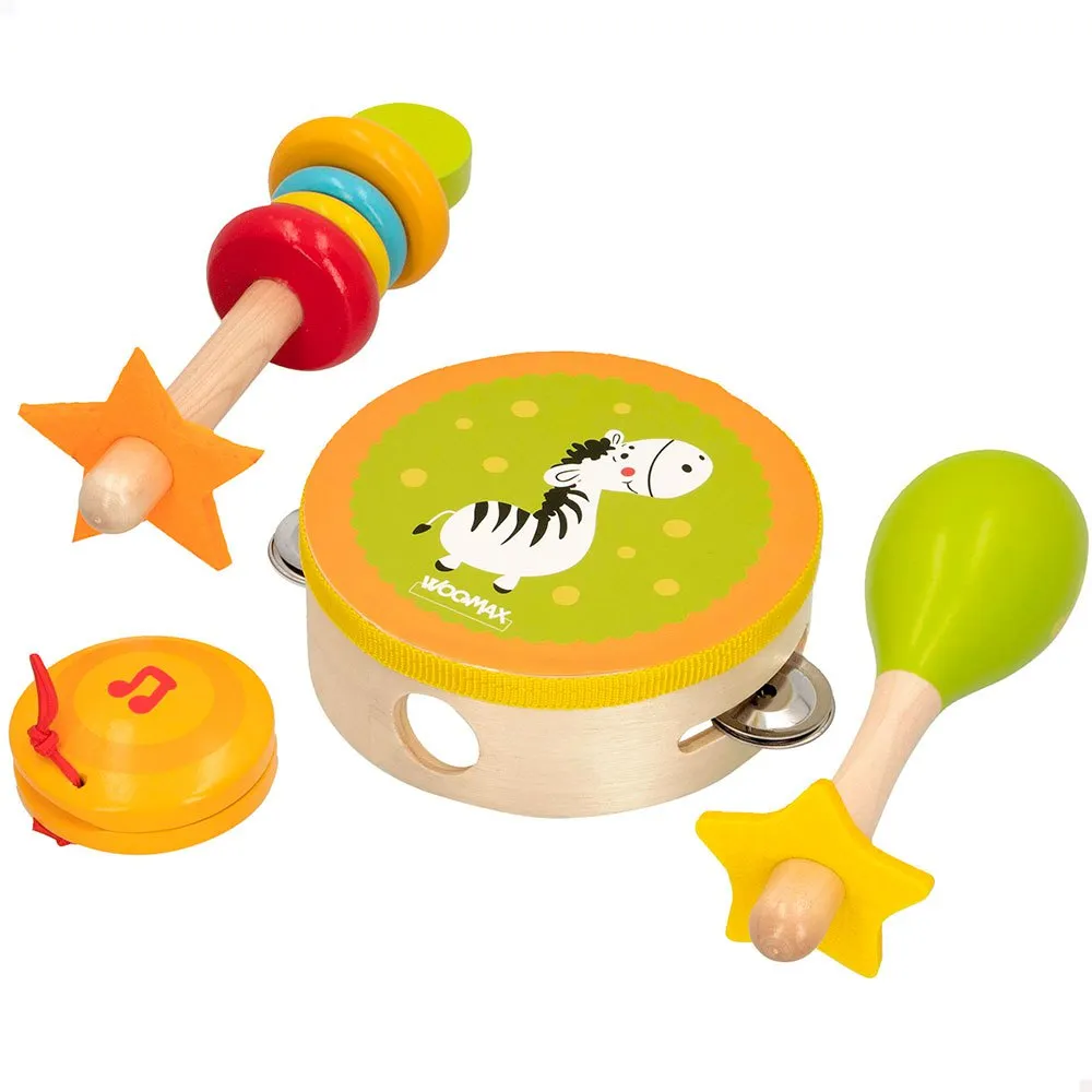 ¡Desarrolla tu lado más artístico con este set de instrumentos musicales de madera de la marca WOOMAX! Incluye 4 instrumentos entre los que encontramos 2 maracas, 1 pandereta y 1 castañuela, todos ellos llenos de colores y dibujos vivos y divertidos.