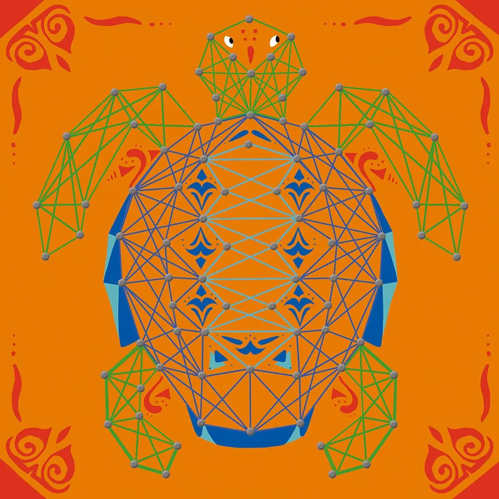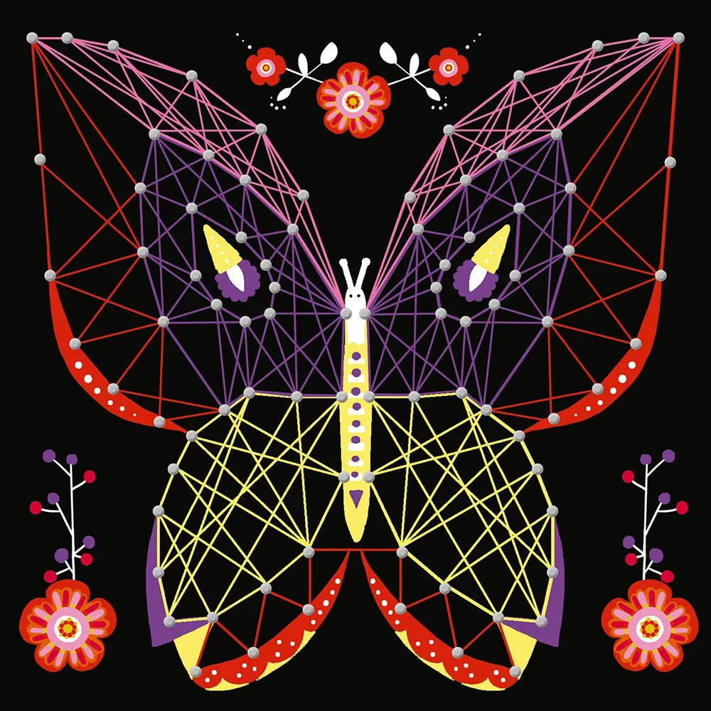 5 cuadros de hilos tensados para llevar a cabo con la ayuda de 10 madejas de hilo de algodón de 7 metros, 800 clavos y una herramienta para clavar los clavos.
