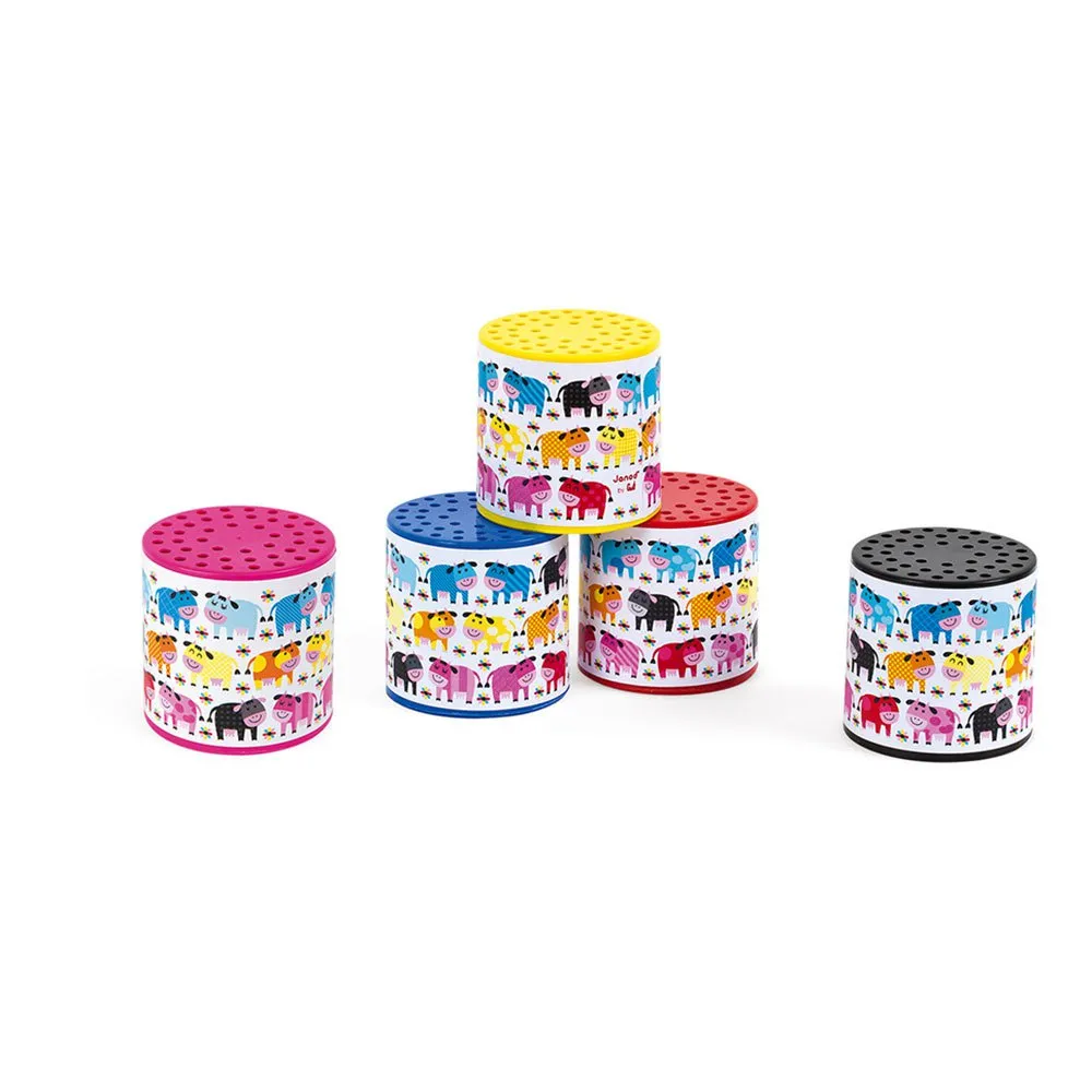 4 cajas con tapa roja, 2 con tapa amarilla, 2 con tapa azul, 2 con tapa rosa y 2 con tapa negra.