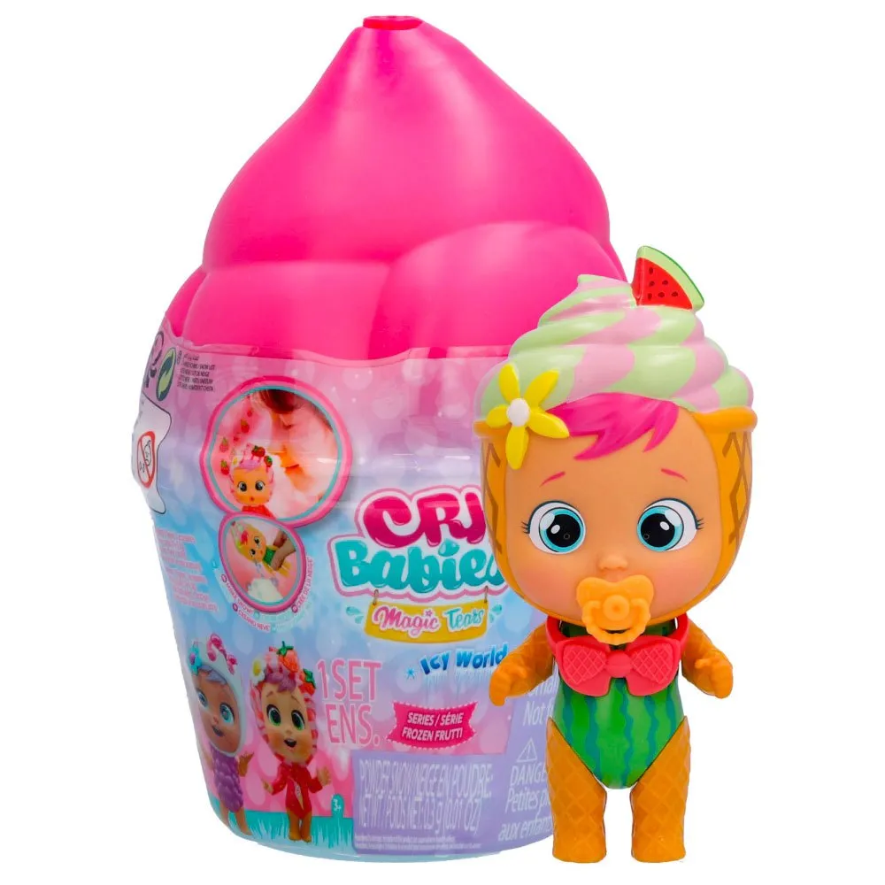 Bebés Llorones Lágrimas Mágicas ¡Descubre la nueva colección de Icy World Frozzen Frutti de los Bebés Llorones Lágrimas Mágicas! ¡Tus personajes favoritos de la Baía Tutti Frutti se han congelado y ahora son helados! Hay 8+ personajes diferentes para coleccionar, cada uno huele a su fruta! La cápsula tiene forma de helado, con foam blandito en la parte superior! Ábrela y descubre tu personaje y todas sus 9 sorpresas:biberón, chupete, un lazo, 4 accesorios personalizados, un accesorio único y una hoja de pegatinas.