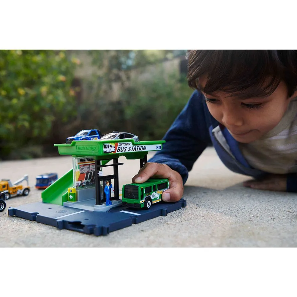La estación de autobuses Matchbox™ Action Drivers™ viene con un autobús Matchbox™ a escala 1:64, y cuando llega a la estación, activa una figura en la parada de autobús para moverse.