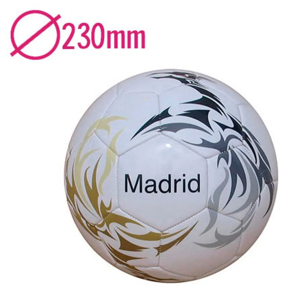 Balón de fútbol cuero impreso la palabra Madrid con el color blanco, oro y negro.