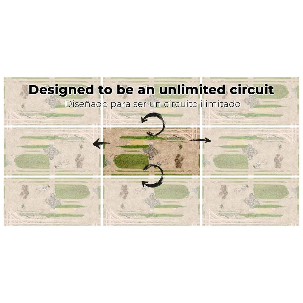 ¡SORPRESA! Puedes unir más moquetas iguales ya que hemos diseñado las uniones para que los caminos coincidan y puedas ampliar tu circuito sin límite. Por ejemplo, con 3 moquetas vas a tener un circuito de 4 metros cuadrados, con un formato rectangular de 2,1×2 metros o bien formato largo de 0,70×6 metros, perfecto para las carreras CRAWLER CHALLENGE.