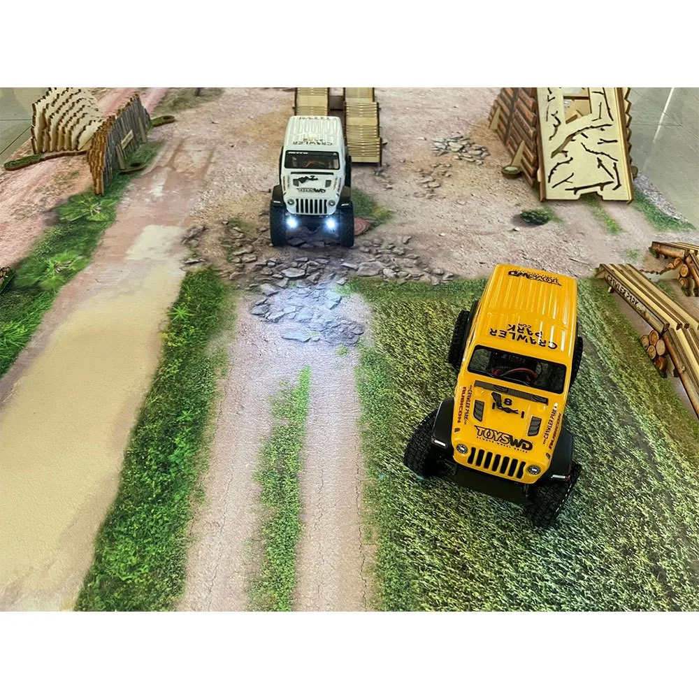 Esta moqueta te aporta el realismo off-road escala que no tienes en casa, circula por los caminos con efecto piedra, barro, arena y hierba mientras subes por los obstáculos Crawler park. Las medidas de la moqueta son de 200x70cm.
